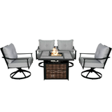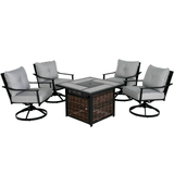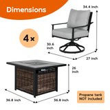 Crafted for comfort and style, this set features a durable fire pit table with a sleek design, complemented by 4 cozy, cushioned chairs. Perfect for gatherings under the stars or cozy evenings by the fire, it's your invitation to relax and unwind in sophisticated outdoor luxury.