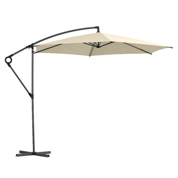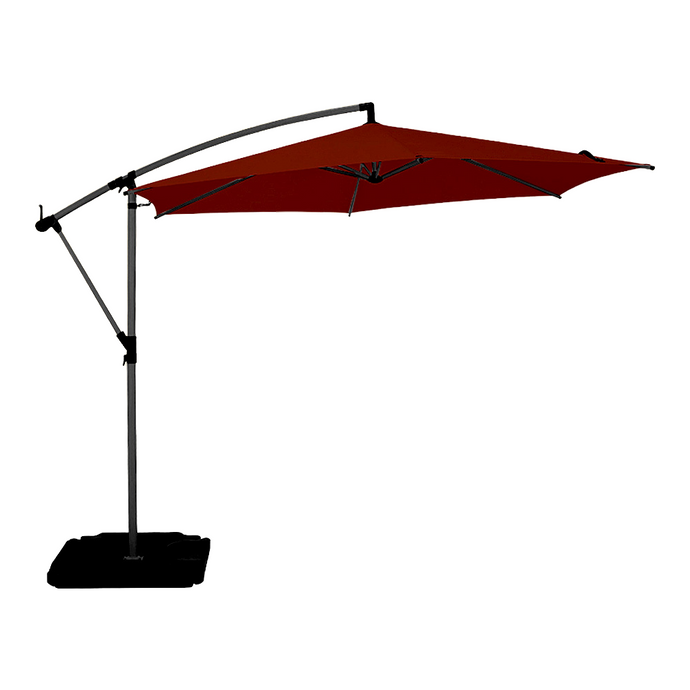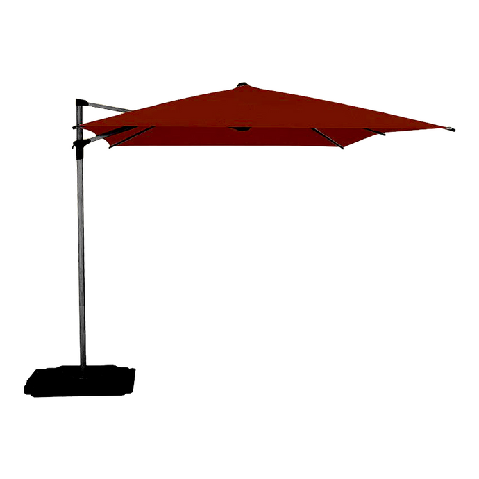 A cantilever umbrella is suspended and supported by a rod placed to one side of its canopy and requires a solid umbrella base for support. This design keeps the pole out of the way while providing shade over a large area.