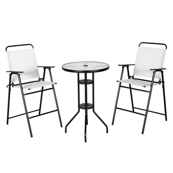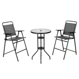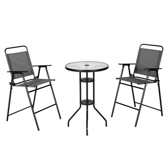This sleek three-piece bar set is a versatile choice for both indoor and outdoor settings. Perfect for compact indoor and outdoor spaces, with the option to add umbrellas for extra protection.