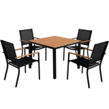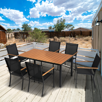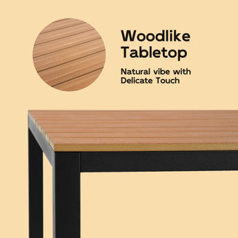 This set offers the great blend of practicality and style, featuring a sturdy steel frame and a stunning simulated wood tabletop. The deep wood color and texture adds a touch of nature and modernity to your outdoor décor.