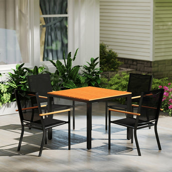 The dining set is crafted from weather-resistant materials that require minimal maintenance. Simply wipe down the tabletop and chairs with a damp cloth to remove dirt, dust, or spills—making cleaning quick and easy.