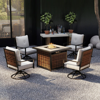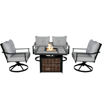 Crafted for comfort and style, this set features a durable fire pit table with a sleek design, complemented by 4 cozy, cushioned chairs. Perfect for gatherings under the stars or cozy evenings by the fire, it's your invitation to relax and unwind in sophisticated outdoor luxury.
