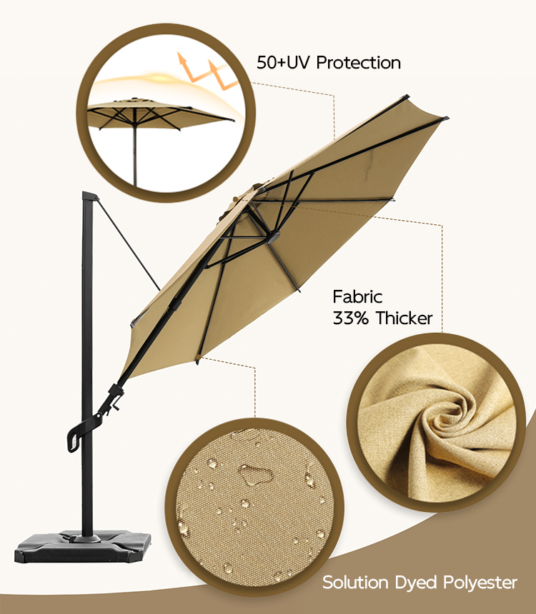 The Vienna cantilever umbrella features a generous canopy size of 9.8 ft, providing ample shade for your outdoor space.