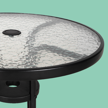 Yes, it does! The table has a built-in umbrella hole, so you can easily add an umbrella for shade when you’re dining outside.
