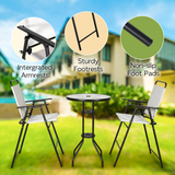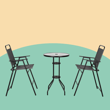 This sleek three-piece bar set is a versatile choice for both indoor and outdoor settings. Perfect for compact indoor and outdoor spaces, with the option to add umbrellas for extra protection.