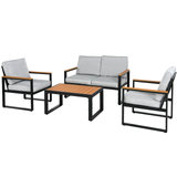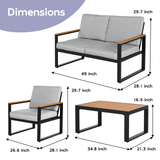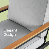 The sofa set is crafted from premium rust-resistant aluminum, featuring a faux wood finish on the armrests and coffee table top. This combination offers durability and elegance while withstanding the elements.