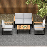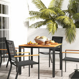 Elevate your living space with this elegant patio furniture set. Its modern design seamlessly blends aluminum and wood for a sophisticated, natural look that complements any decor, indoors or out. Showcase your impeccable style and create an inviting atmosphere for relaxation or entertaining.