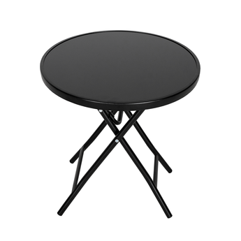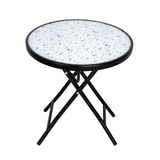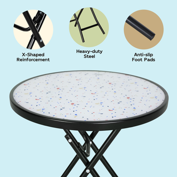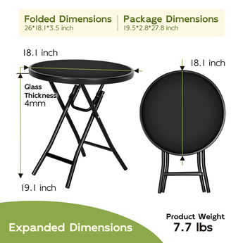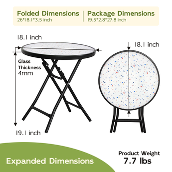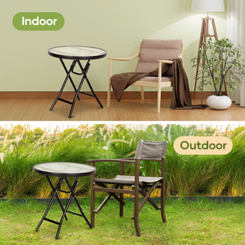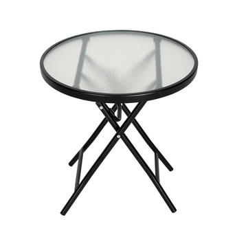 The tabletop is made of 4mm high-performance toughened glass, which is sturdy, durable, and waterproof. The frame is constructed from powder-coated steel, making it rust-resistant and UV-protected for outdoor use.