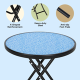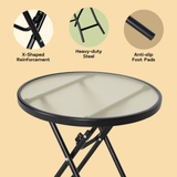 The tabletop is made of 4mm high-performance toughened glass, which is sturdy, durable, and waterproof. The frame is constructed from powder-coated steel, making it rust-resistant and UV-protected for outdoor use.